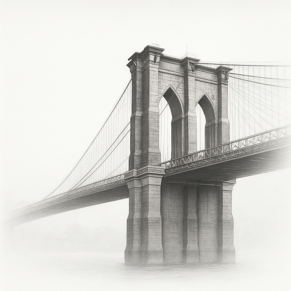 I illustrated only the central span of the Brooklyn Bridge, allowing the structure to fade at the edges to suggest access, connection, and justice extending beyond the frame. The bridge was digitally manipulated in Photoshop using color inversion (negative image) to create a bold, high-contrast visual with a refined, editorial tone appropriate for a legal publication.