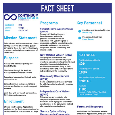 The Project Ongoing design support for Continuum Fiscal Services, an Atlanta-based company. Work has ranged from reformatting employment forms and maintaining their website to producing marketing collateral and trade show materials.